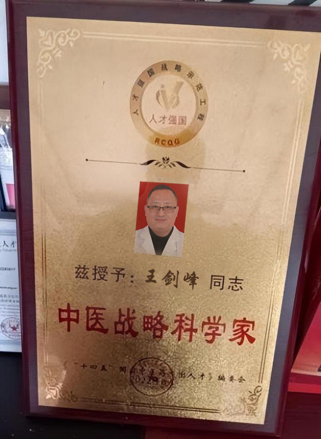 王剑峰院长凭着对中医事业的热爱,执着的追求,以高尚的医德,精湛的医术和守正创新、无我利他的精神,在平凡的岗位上创造出了不平凡的业绩,赢得了广大患者普遍赞誉。2022年王剑峰院长被授予"中医战略科学家"荣誉称号,这也是国家对王剑峰主任在国医事业传承和发展并不断做出突出贡献的坚决肯定